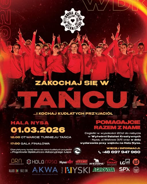 - Jest z nami ŁAPA Nyskie Pogotowie Opiekuńczo - Adopcyjne dla Zwierząt. Przyjdź i przynieś coś dla naszych kudłatych przyjaciół! Cegiełki w wysokości 10 zł będą mozliwe do nabycia w dniu wydarzenia przy wejściu do Hali Nysa. W zamian gwarantujemy że nacieszysz oczy gigantyczną dawką pięknych choreografii i naładujesz się endorfinami, bo taniec to piękna forma sztuki! - informuje Wytwórnia Działań Kreatywnych.